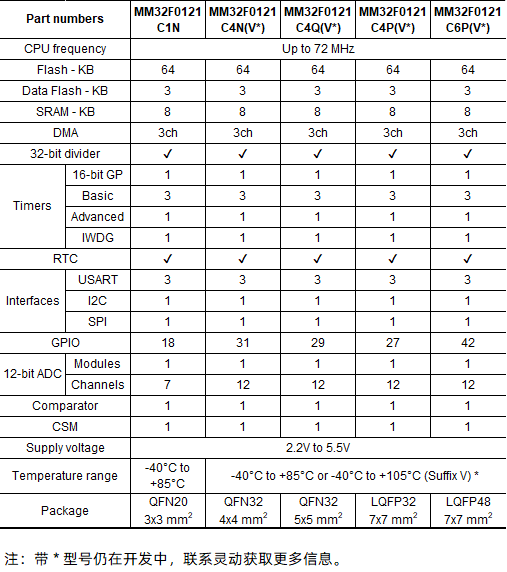 The MM32F0120 is available in four package options: QFN20, QFN32, LQFP32, and LQFP48, with industrial-grade (-40~85°C) and extended industrial-grade (-40~105°C) temperature options. The product line includes five models, as detailed in the table below. For custom packaging needs, please feel free to contact us for further discussion.